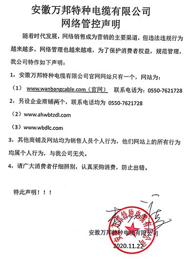 鄭重聲明:安徽萬邦特種電纜有限公司官方網站為:www_wanbangcable_com.lyjtyn.com,除此之外無任何子網站或合作網站,其余均為假冒偽劣。電話:0550-7621728 13485756353 地 址:安徽省天長市滁州高新技術產業開發區經四路29號